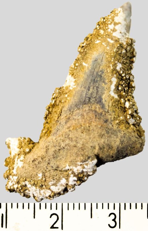 Зуб. Акула. Otodus subserratus (Agassiz, 1843). Классификация: Хордовые Chordata, Позвоночные Vertebrata, Хрящевые рыбы Chondrichthyes, Пластиножаберные Elasmobranchii
