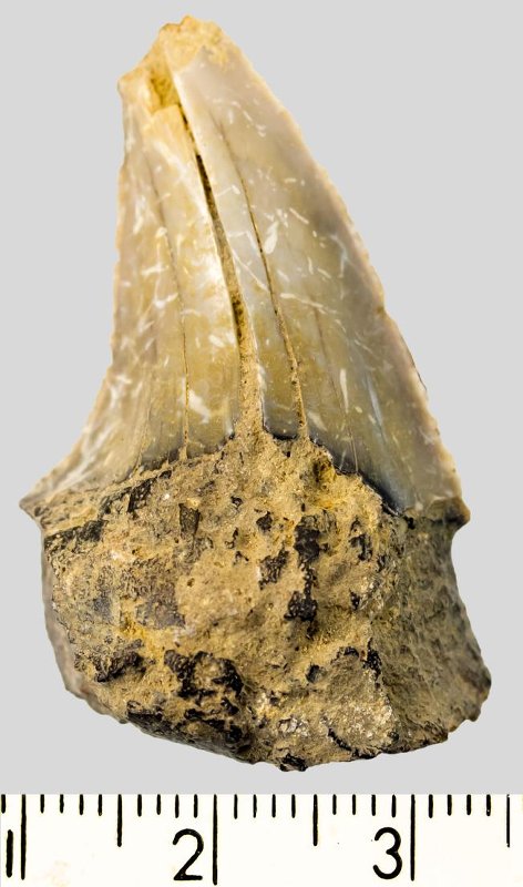 Зуб. Акула. Otodus subserratus (Agassiz, 1843). Классификация: Хордовые Chordata, Позвоночные Vertebrata, Хрящевые рыбы Chondrichthyes, Пластиножаберные Elasmobranchii