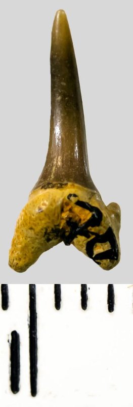 Мелкий передний зуб с коронкой серо-бурого цвета, колюще-режущего типа, S-образно изогнутой, с гладким режущим краем. Корень охристый, арочный, умеренно массивный, со следами окатанности. С лингвальной стороны корня питательная борозда. Имелась одна пара добавочных зубцов коронки, сохранился только правый.