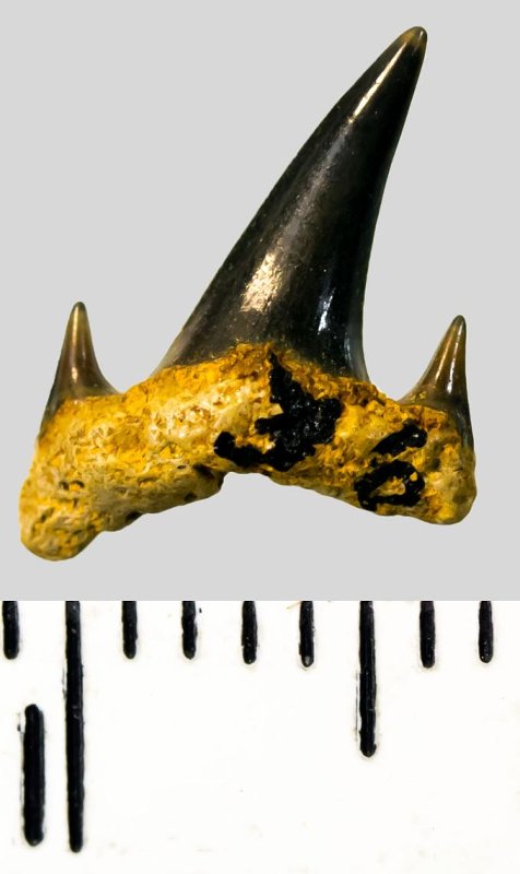 Мелкий боковой зуб с коронкой черного цвета, режущего типа, S-образно изогнутой, с гладким режущим краем. Корень охристый, арочный, умеренно массивный, со следами окатанности и эрозии. Имеется одна пара добавочных зубцов коронки.