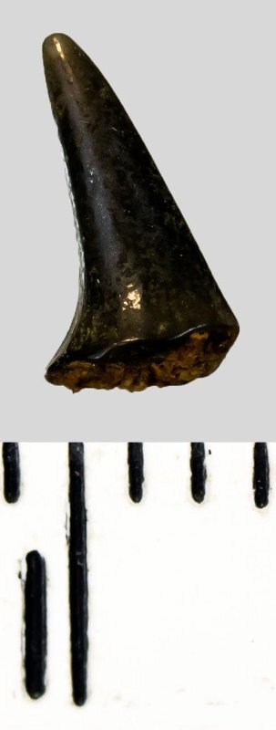 Коронка мелкого бокового зуба черного цвета, режущего типа, S-образно изогнутая, с гладким режущим краем. Корень не сохранился.