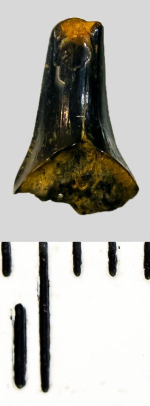Поврежденная сколами коронка мелкого бокового зуба черного цвета, режущего типа, S-образно изогнутая, с гладким режущим краем. С лингвальной стороны у основания коронки на эмали имеется скульптура в виде слабой продольной струйчатости. Корень не сохранился.