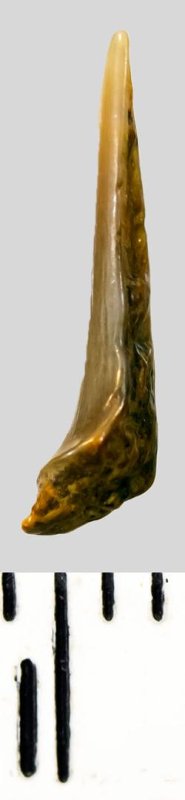 Левая половина коронки мелкого зуба охристо-кремового цвета, S-образно изогнутая, с гладким режущим краем. С лингвальной стороны у основания коронки на эмали имеется скульптура в виде слабой продольной струйчатости. Корень не сохранился.