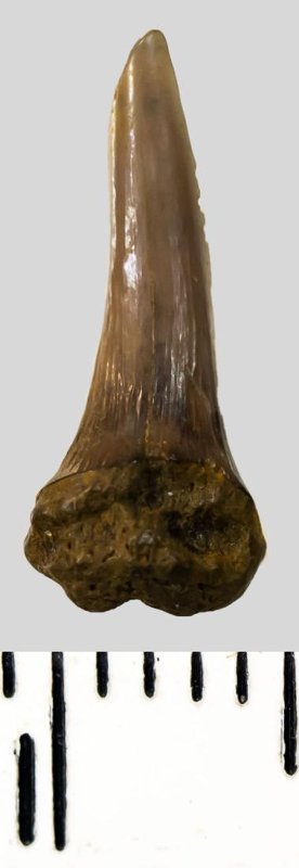 Зуб (фрагмент). Акула. Scapanorhynchus sp. Классификация: Хордовые Chordata, Позвоночные Vertebrata, Хрящевые рыбы Chondrichthyes, Пластиножаберные Elasmobranchii, Акулы Selachii, Ламнообразные Lamniformes