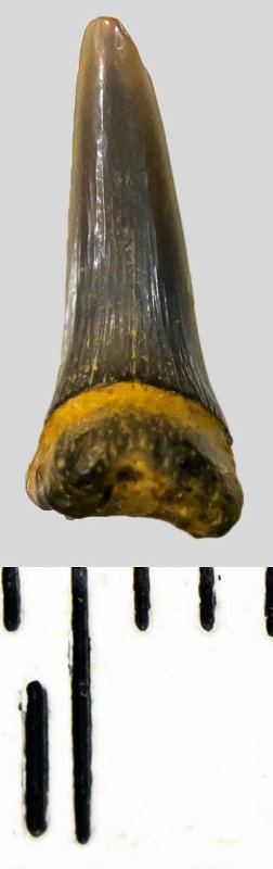 Зуб (фрагмент). Акула. Scapanorhynchus sp. Классификация: Хордовые Chordata, Позвоночные Vertebrata, Хрящевые рыбы Chondrichthyes, Пластиножаберные Elasmobranchii, Акулы Selachii, Ламнообразные Lamniformes