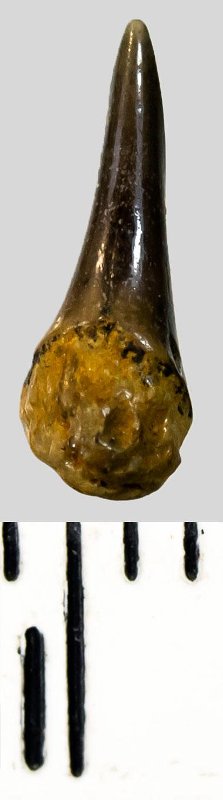 Коронка мелкого бокового зуба бурого цвета, колюще-режущего типа, S-образно изогнутая, с гладким режущим краем. Корень охристый, сильно окатанный, сохранился фрагментарно.