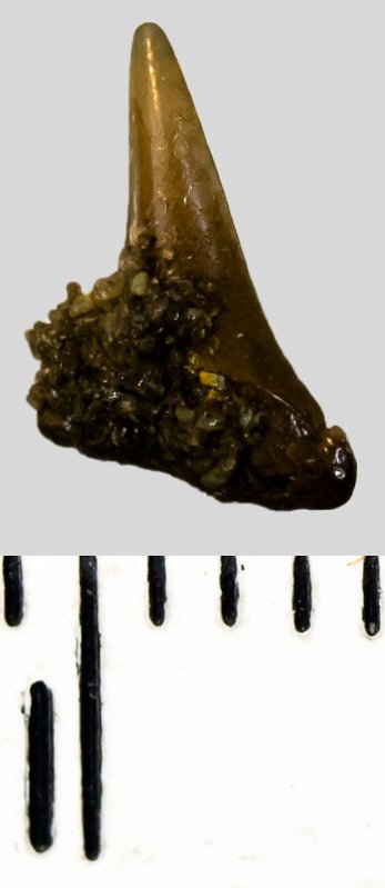 Коронка мелкого бокового зуба темно-охристого цвета, режущего типа, S-образно изогнутая, с гладким режущим краем. Корень буро-охристый, сильно окатанный, с остатками вмещающей породы на поверхности, сохранился фрагментарно.