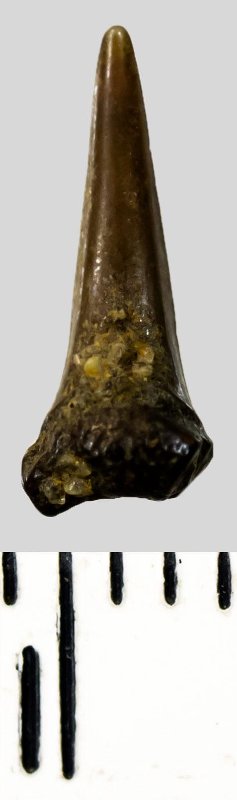 Коронка мелкого зуба бурого цвета, колюще-режущего типа, S-образно изогнутая, с гладким режущим краем. Корень бурый, сильно окатанный, сохранился фрагментарно.