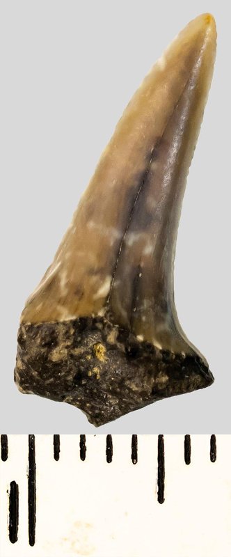 Зуб (фрагмент). Акула. Striatolamia elegans (Agassiz, 1838). Классификация: Хордовые Chordata, Позвоночные Vertebrata, Хрящевые рыбы Chondrichthyes, Пластиножаберные Elasmobranchii