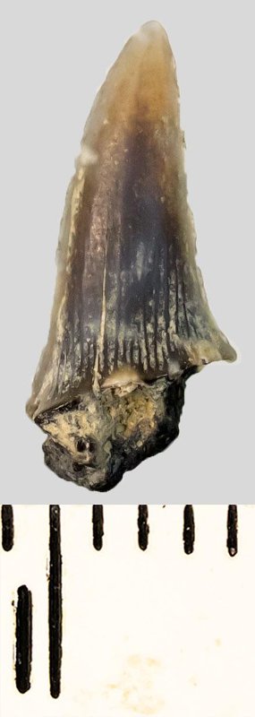 Зуб (фрагмент). Акула. Striatolamia elegans (Agassiz, 1838). Классификация: Хордовые Chordata, Позвоночные Vertebrata, Хрящевые рыбы Chondrichthyes, Пластиножаберные Elasmobranchii