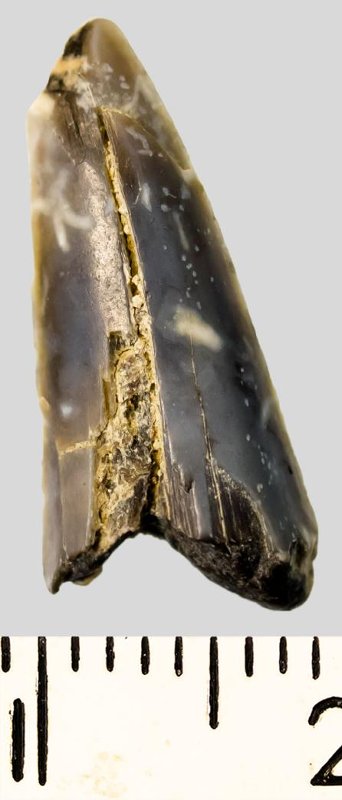 Зуб (фрагмент). Акула. Hypotodus robustus (Leriche, 1921). Классификация: Хордовые Chordata, Позвоночные Vertebrata, Хрящевые рыбы Chondrichthyes, Пластиножаберные Elasmobranchii