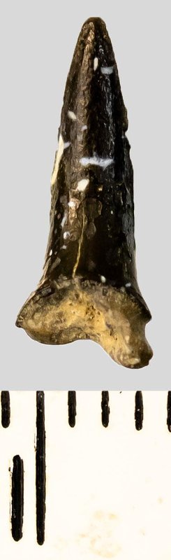 Зуб (фрагмент). Акула. Hypotodus robustus (Leriche, 1921). Классификация: Хордовые Chordata, Позвоночные Vertebrata, Хрящевые рыбы Chondrichthyes, Пластиножаберные Elasmobranchii