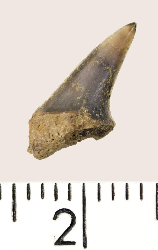 Зуб (фрагмент). Акула. Hypotodus sp. Классификация: Хордовые Chordata, Позвоночные Vertebrata, Хрящевые рыбы Chondrichthyes, Пластиножаберные Elasmobranchii
