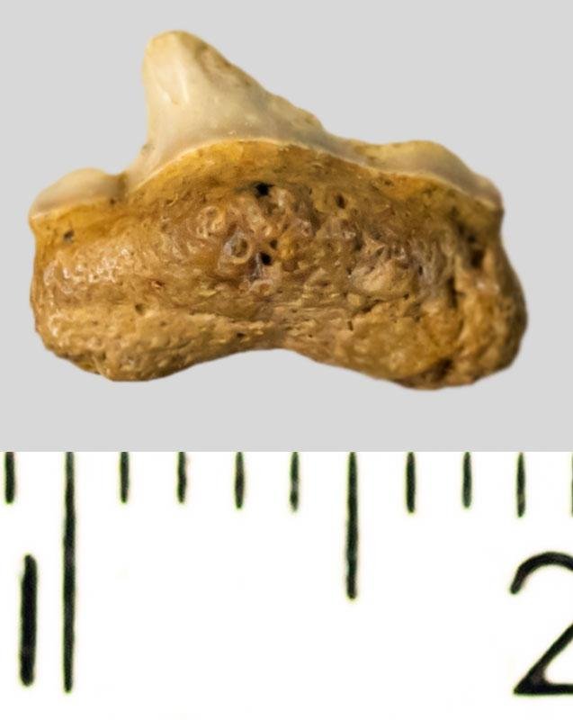 Средних размеров задний зуб (из последних в ряду) с коронкой светло-серого цвета, режущего типа, без скульптуры, с гладким режущим краем. Корень серовато-охристый, арочный, массивный, с широкими ветвями. Имеется одно питательное отверстие с лингвальной стороны корня. Присутствует пара широких режущих добавочных зубцов коронки, слитых с основной вершиной.