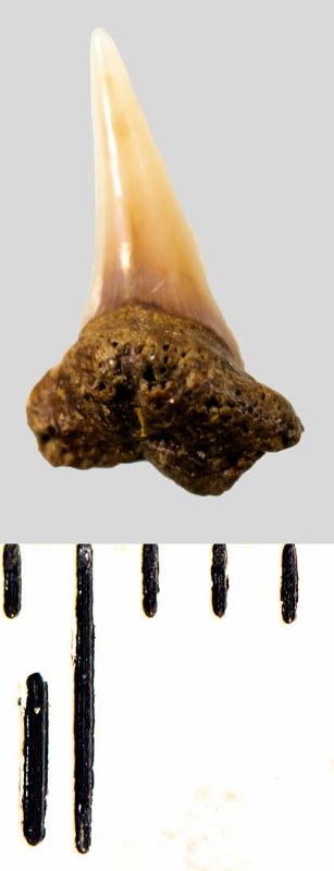 Зуб. Акула. Eostriatolamia subulata (Agassiz, 1843). Классификация: Хордовые Chordata, Позвоночные Vertebrata, Хрящевые рыбы Chondrichthyes, Пластиножаберные Elasmobranchii, Акулы Selachii, Ламнообразные Lamniformes, Песчаные акулы Odontaspididae