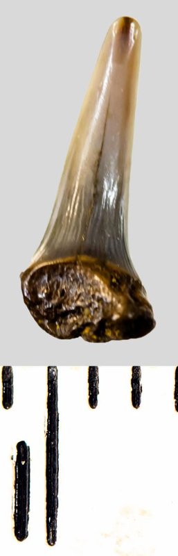 Зуб. Акула. Eostriatolamia subulata (Agassiz, 1843). Классификация: Хордовые Chordata, Позвоночные Vertebrata, Хрящевые рыбы Chondrichthyes, Пластиножаберные Elasmobranchii, Акулы Selachii, Ламнообразные Lamniformes, Песчаные акулы Odontaspididae