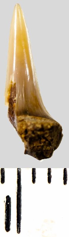 Зуб. Акула. Eostriatolamia subulata (Agassiz, 1843). Классификация: Хордовые Chordata, Позвоночные Vertebrata, Хрящевые рыбы Chondrichthyes, Пластиножаберные Elasmobranchii, Акулы Selachii, Ламнообразные Lamniformes, Песчаные акулы Odontaspididae
