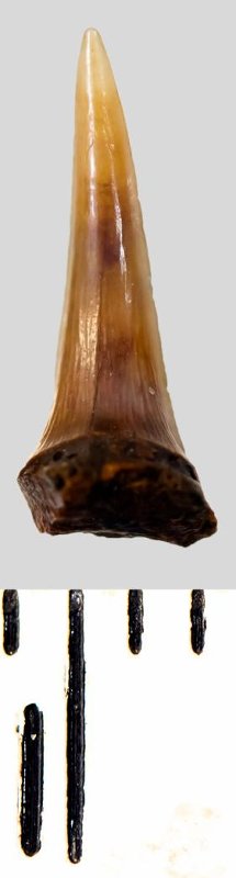 Зуб. Акула. Eostriatolamia subulata (Agassiz, 1843). Классификация: Хордовые Chordata, Позвоночные Vertebrata, Хрящевые рыбы Chondrichthyes, Пластиножаберные Elasmobranchii, Акулы Selachii, Ламнообразные Lamniformes, Песчаные акулы Odontaspididae