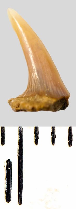 Зуб. Акула. Eostriatolamia subulata (Agassiz, 1843). Классификация: Хордовые Chordata, Позвоночные Vertebrata, Хрящевые рыбы Chondrichthyes, Пластиножаберные Elasmobranchii, Акулы Selachii, Ламнообразные Lamniformes, Песчаные акулы Odontaspididae