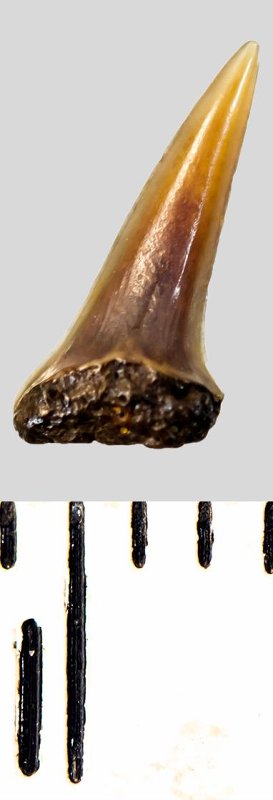 Зуб. Акула. Eostriatolamia subulata (Agassiz, 1843). Классификация: Хордовые Chordata, Позвоночные Vertebrata, Хрящевые рыбы Chondrichthyes, Пластиножаберные Elasmobranchii, Акулы Selachii, Ламнообразные Lamniformes, Песчаные акулы Odontaspididae