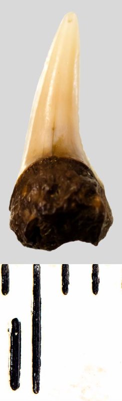 Зуб. Акула. Eostriatolamia subulata (Agassiz, 1843). Классификация: Хордовые Chordata, Позвоночные Vertebrata, Хрящевые рыбы Chondrichthyes, Пластиножаберные Elasmobranchii, Акулы Selachii, Ламнообразные Lamniformes, Песчаные акулы Odontaspididae