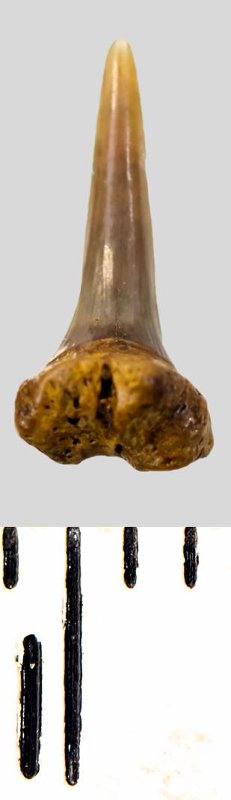 Зуб. Акула. Eostriatolamia subulata (Agassiz, 1843). Классификация: Хордовые Chordata, Позвоночные Vertebrata, Хрящевые рыбы Chondrichthyes, Пластиножаберные Elasmobranchii, Акулы Selachii, Ламнообразные Lamniformes, Песчаные акулы Odontaspididae