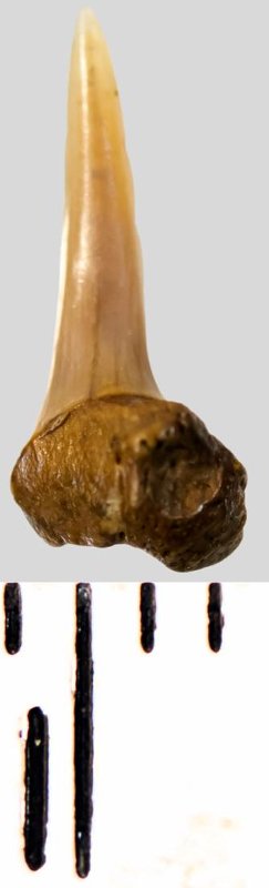 Зуб. Акула. Eostriatolamia subulata (Agassiz, 1843). Классификация: Хордовые Chordata, Позвоночные Vertebrata, Хрящевые рыбы Chondrichthyes, Пластиножаберные Elasmobranchii, Акулы Selachii, Ламнообразные Lamniformes, Песчаные акулы Odontaspididae