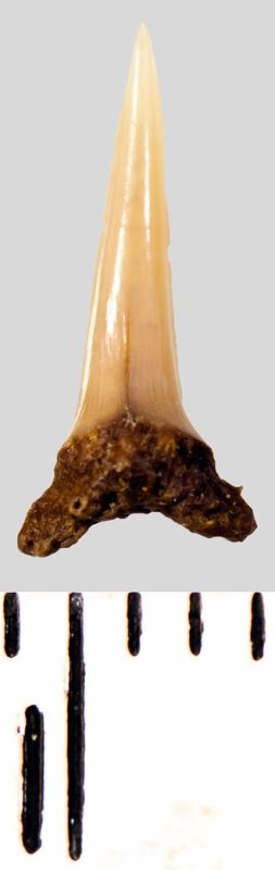 Зуб. Акула. Eostriatolamia subulata (Agassiz, 1843). Классификация: Хордовые Chordata, Позвоночные Vertebrata, Хрящевые рыбы Chondrichthyes, Пластиножаберные Elasmobranchii, Акулы Selachii, Ламнообразные Lamniformes, Песчаные акулы Odontaspididae
