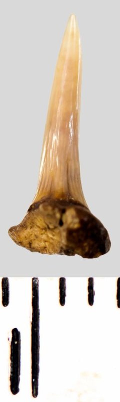 Зуб. Акула. Eostriatolamia subulata (Agassiz, 1843). Классификация: Хордовые Chordata, Позвоночные Vertebrata, Хрящевые рыбы Chondrichthyes, Пластиножаберные Elasmobranchii, Акулы Selachii, Ламнообразные Lamniformes, Песчаные акулы Odontaspididae