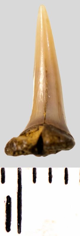 Зуб. Акула. Eostriatolamia subulata (Agassiz, 1843). Классификация: Хордовые Chordata, Позвоночные Vertebrata, Хрящевые рыбы Chondrichthyes, Пластиножаберные Elasmobranchii, Акулы Selachii, Ламнообразные Lamniformes, Песчаные акулы Odontaspididae