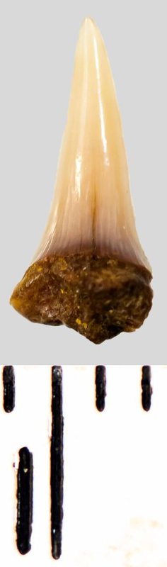 Зуб. Акула. Eostriatolamia subulata (Agassiz, 1843). Классификация: Хордовые Chordata, Позвоночные Vertebrata, Хрящевые рыбы Chondrichthyes, Пластиножаберные Elasmobranchii, Акулы Selachii, Ламнообразные Lamniformes, Песчаные акулы Odontaspididae