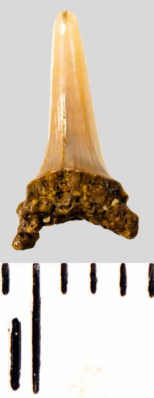 Зуб. Акула. Eostriatolamia subulata (Agassiz, 1843). Классификация: Хордовые Chordata, Позвоночные Vertebrata, Хрящевые рыбы Chondrichthyes, Пластиножаберные Elasmobranchii, Акулы Selachii, Ламнообразные Lamniformes, Песчаные акулы Odontaspididae