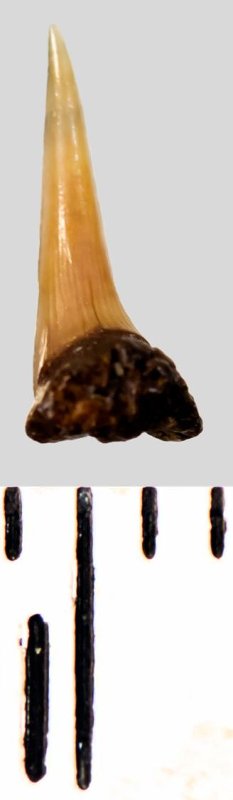 Зуб. Акула. Eostriatolamia subulata (Agassiz, 1843). Классификация: Хордовые Chordata, Позвоночные Vertebrata, Хрящевые рыбы Chondrichthyes, Пластиножаберные Elasmobranchii, Акулы Selachii, Ламнообразные Lamniformes, Песчаные акулы Odontaspididae
