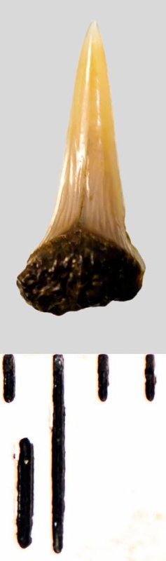 Зуб. Акула. Eostriatolamia subulata (Agassiz, 1843). Классификация: Хордовые Chordata, Позвоночные Vertebrata, Хрящевые рыбы Chondrichthyes, Пластиножаберные Elasmobranchii, Акулы Selachii, Ламнообразные Lamniformes, Песчаные акулы Odontaspididae