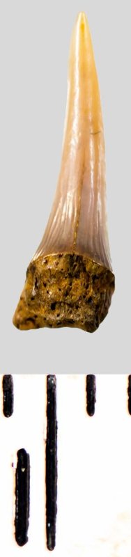 Зуб. Акула. Eostriatolamia subulata (Agassiz, 1843). Классификация: Хордовые Chordata, Позвоночные Vertebrata, Хрящевые рыбы Chondrichthyes, Пластиножаберные Elasmobranchii, Акулы Selachii, Ламнообразные Lamniformes, Песчаные акулы Odontaspididae