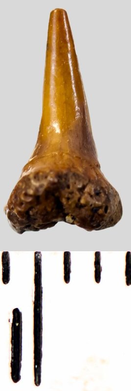 Зуб. Акула. Eostriatolamia subulata (Agassiz, 1843). Классификация: Хордовые Chordata, Позвоночные Vertebrata, Хрящевые рыбы Chondrichthyes, Пластиножаберные Elasmobranchii, Акулы Selachii, Ламнообразные Lamniformes, Песчаные акулы Odontaspididae