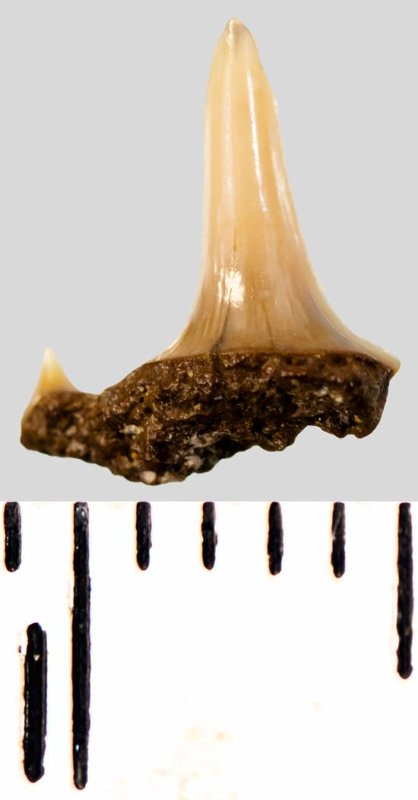 Зуб. Акула. Eostriatolamia subulata (Agassiz, 1843). Классификация: Хордовые Chordata, Позвоночные Vertebrata, Хрящевые рыбы Chondrichthyes, Пластиножаберные Elasmobranchii, Акулы Selachii, Ламнообразные Lamniformes, Песчаные акулы Odontaspididae