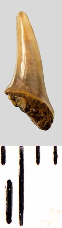 Зуб. Акула. Eostriatolamia subulata (Agassiz, 1843). Классификация: Хордовые Chordata, Позвоночные Vertebrata, Хрящевые рыбы Chondrichthyes, Пластиножаберные Elasmobranchii, Акулы Selachii, Ламнообразные Lamniformes, Песчаные акулы Odontaspididae