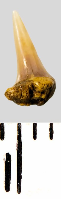 Зуб. Акула. Eostriatolamia subulata (Agassiz, 1843). Классификация: Хордовые Chordata, Позвоночные Vertebrata, Хрящевые рыбы Chondrichthyes, Пластиножаберные Elasmobranchii, Акулы Selachii, Ламнообразные Lamniformes, Песчаные акулы Odontaspididae