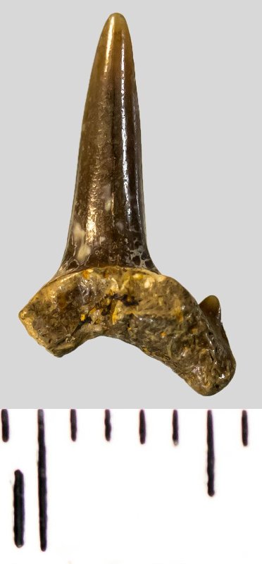 Передний зуб серо-коричневого цвета с высокой коронкой колюще-режущего типа. Коронка S-образно изогнута, без скульптуры, с гладким режущим краем. Корень серо-охристый, арочный, умеренно массивный, со следами окатанности, сохранился не полностью. Имелась одна пара боковых зубцов, сохранился правый.