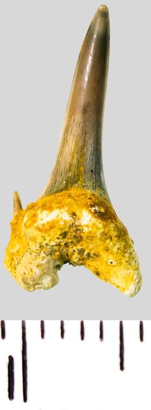 Передний зуб серого цвета с высокой коронкой колюще-режущего типа. Коронка S-образно изогнута, с гладким режущим краем. С лингвальной стороны у основания коронки на эмали имеется скульптура в виде слабой продольной струйчатости. Корень светло-охристый, арочный, умеренно массивный, со следами окатанности и остатками породы на левой ветви. Имеется питательная щель. Имелась одна пара боковых зубцов, сохранился левый.