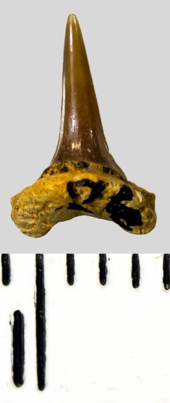 Мелкий боковой зуб с коронкой темно-коричневого цвета, колюще-режущего типа, S-образно изогнутой, с гладким режущим краем. Корень охристый, арочный, умеренно массивный, со следами окатанности. Добавочные зубцы коронки не сохранились.