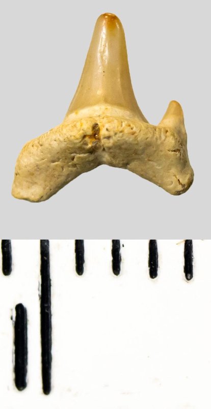 Мелкий боковой зуб с коронкой кремового цвета, режущего типа, S-образно изогнутой, с гладким режущим краем. Корень сливочного цвета, арочный, умеренно массивный, со следами окатанности. С лингвальной стороны корня питательная борозда. Имелась одна пара добавочных зубцов коронки, сохранился только правый.