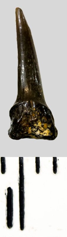 Коронка мелкого зуба бурого цвета, колюще-режущего типа, S-образно изогнутая, с гладким режущим краем. С лингвальной стороны у основания коронки на эмали имеется скульптура в виде слабой продольной струйчатости. Корень не сохранился.