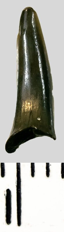 Коронка мелкого зуба серо-бурого цвета, режущего типа, S-образно изогнутая, с гладким режущим краем. Корень не сохранился.