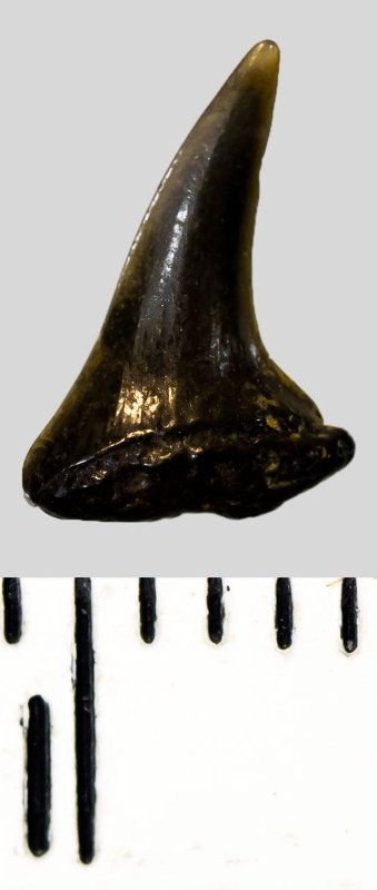 Коронка мелкого бокового зуба бурого цвета, режущего типа, S-образно изогнутая, с гладким режущим краем. Корень не сохранился.