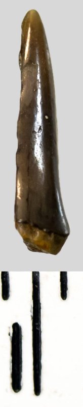Правая половина коронки мелкого бокового зуба серо-бурого цвета, S-образно изогнутая, с гладким режущим краем. Корень не сохранился.