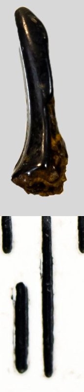 Левая половина коронки мелкого бокового зуба черного цвета, S-образно изогнутая, с гладким режущим краем. Корень не сохранился.