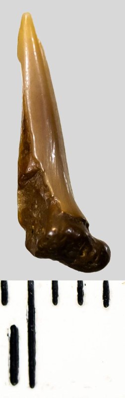 Правая половина коронки мелкого зуба кремового цвета, S-образно изогнутая, с гладким режущим краем. Корень буро-охристый, сильно окатанный, сохранился фрагментарно.