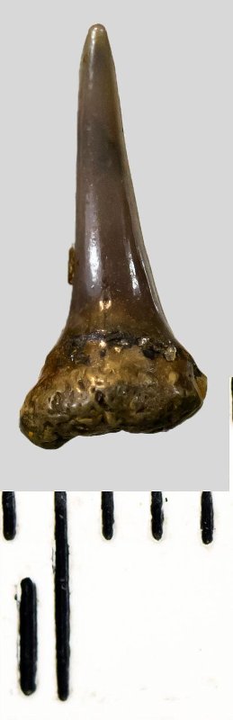Коронка мелкого бокового зуба темно-бежевого цвета, колюще-режущего типа, S-образно изогнутая, с гладким режущим краем. Корень охристый, сильно окатанный, сохранился фрагментарно.
